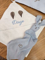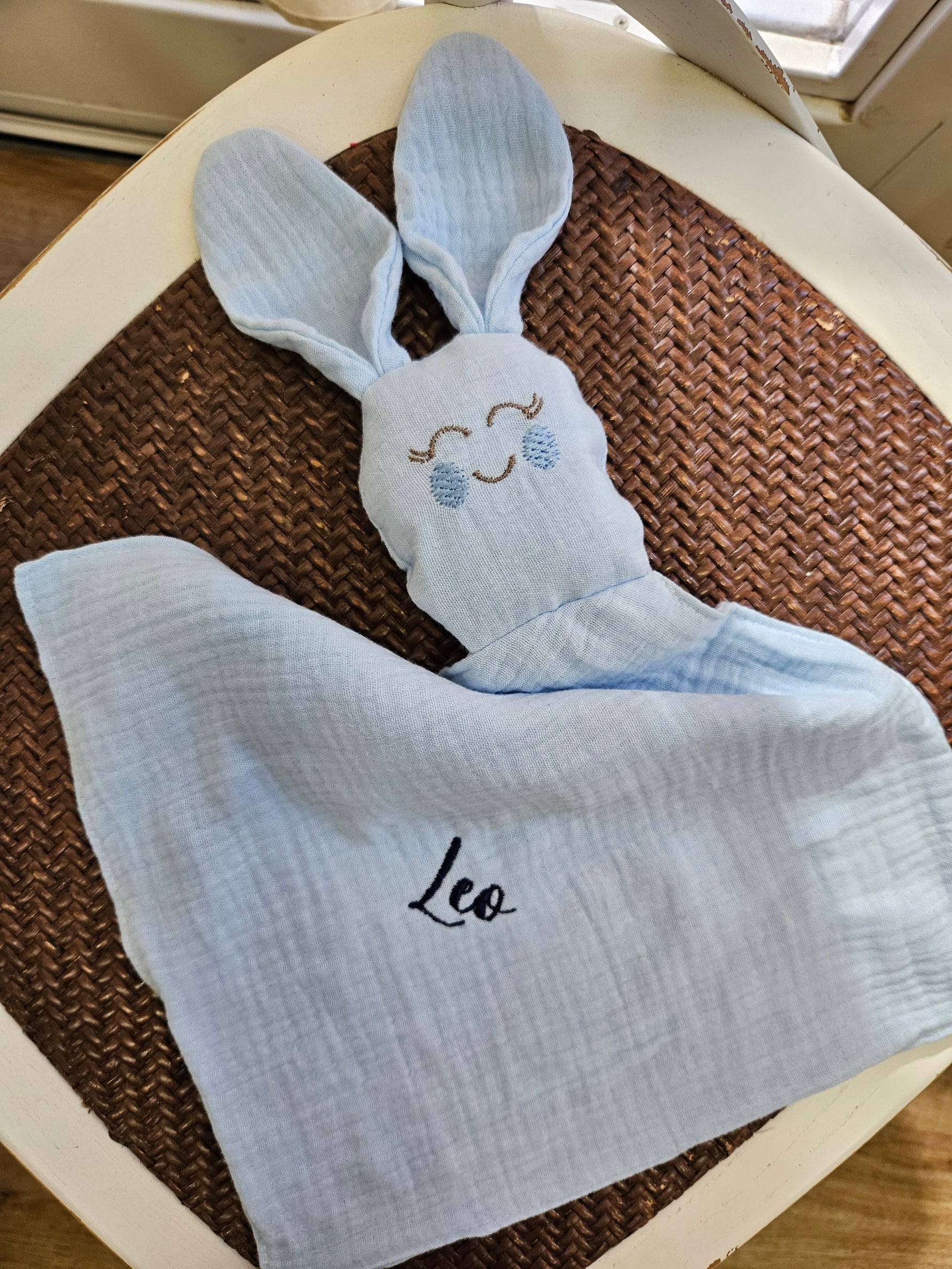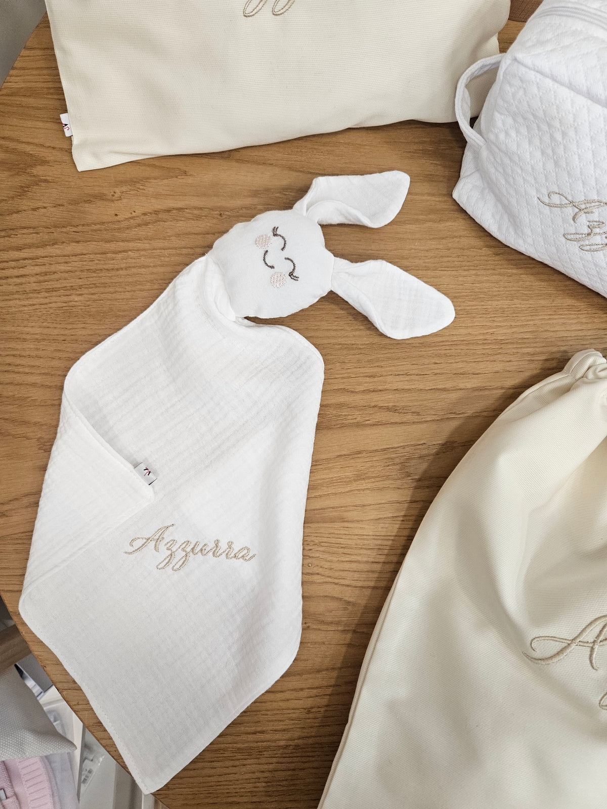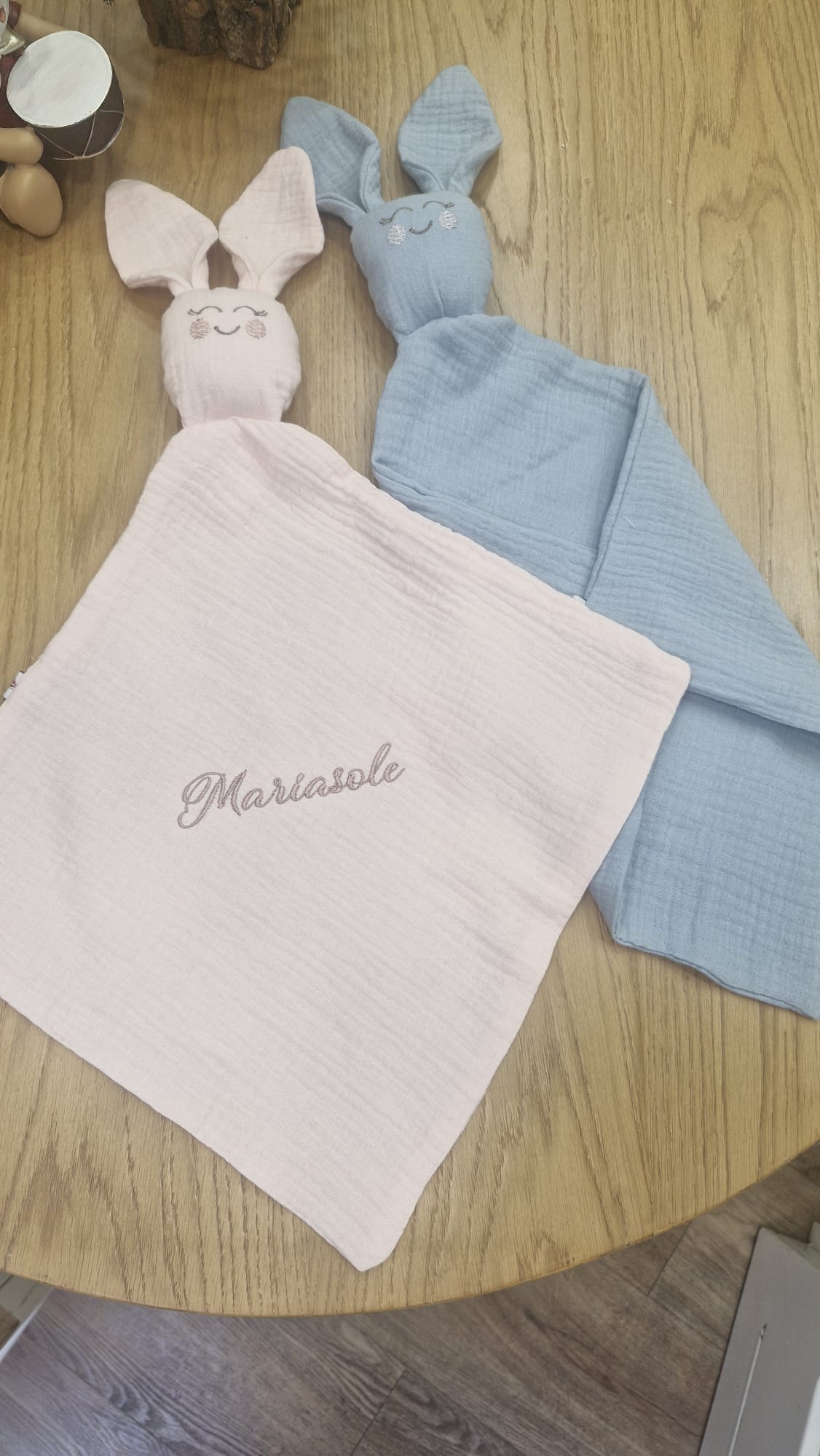 Morbido e leggero, questo dudù in mussola di cotone a forma di coniglietto è pensato per offrire al tuo bimbo un comfort naturale e sicuro.