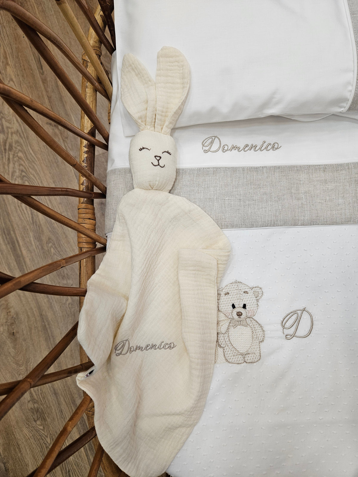 La mussola, soffice e traspirante, avvolge dolcemente il peluche rendendolo perfetto per la nanna ei momenti di coccola.
