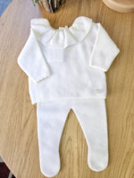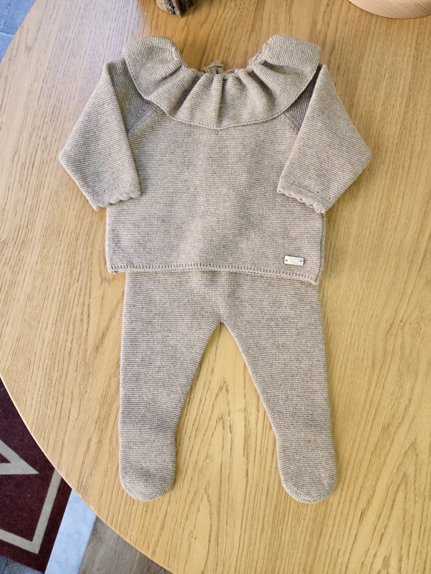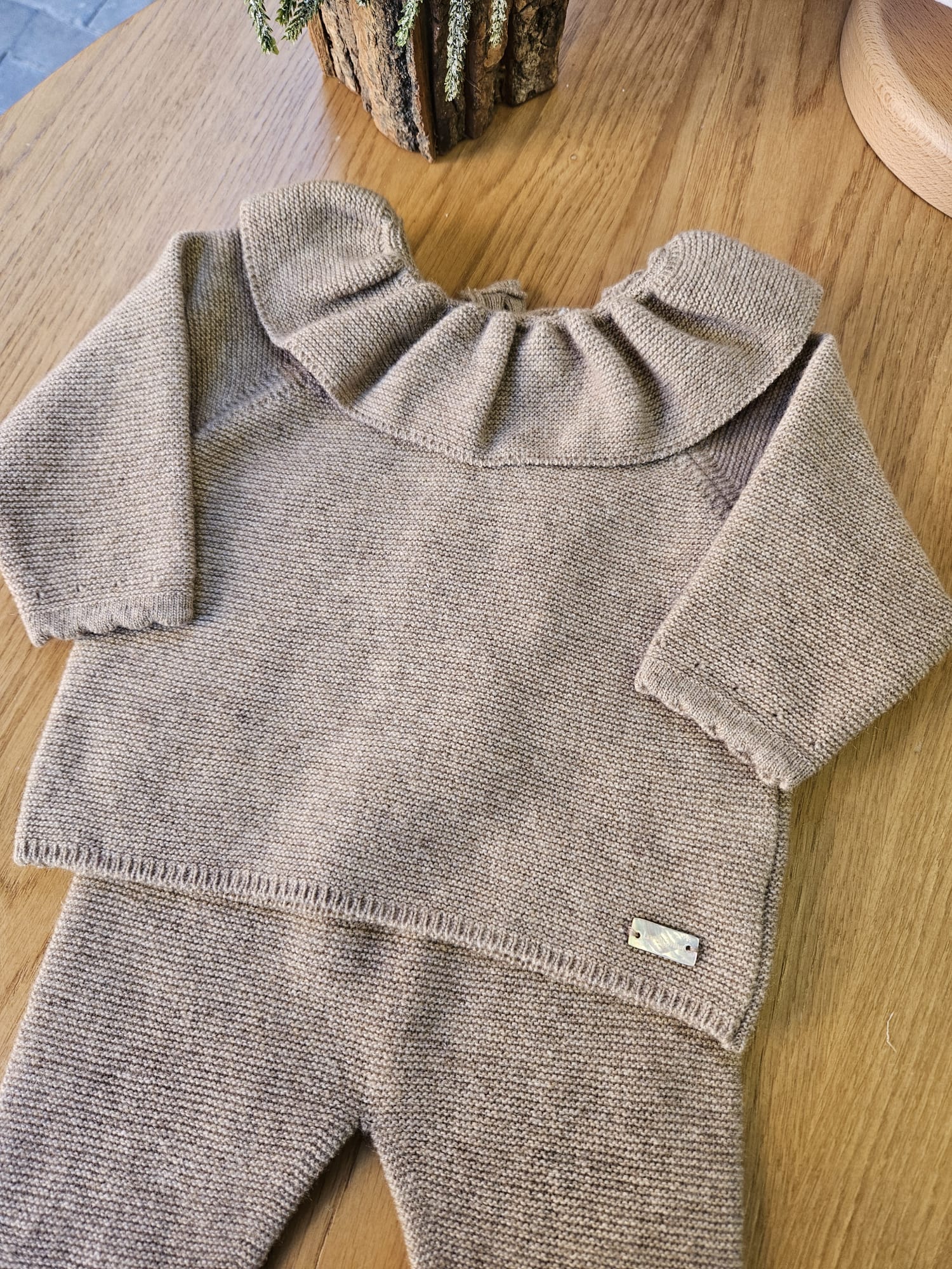 Completo due pezzi lavorato a maglia con un tocco di cashmere. Maglione con colletto arricciato che si chiude con bottoni in madreperla sul retro. Pantaloni senza cuciture per un maggiore comfort.
