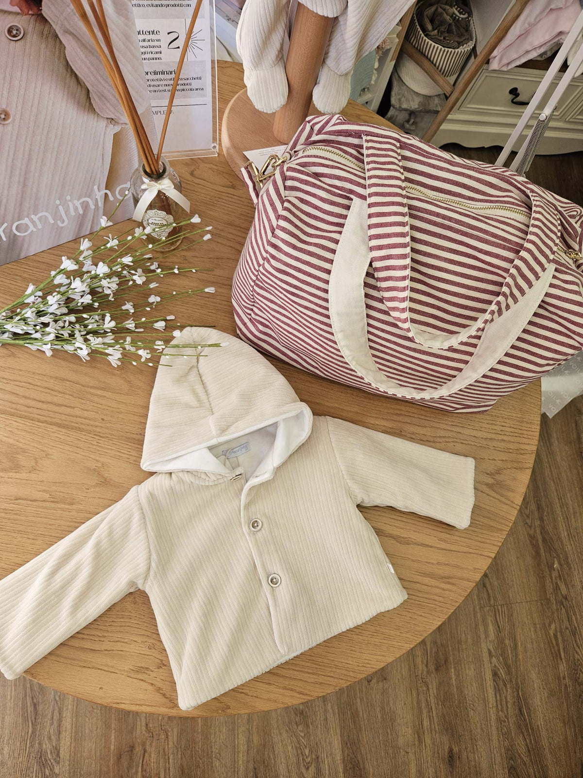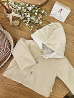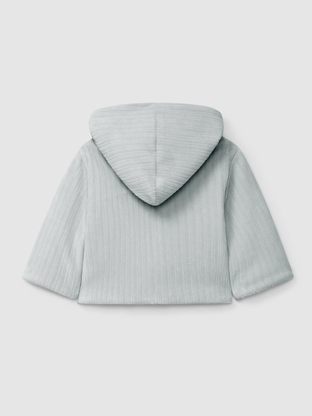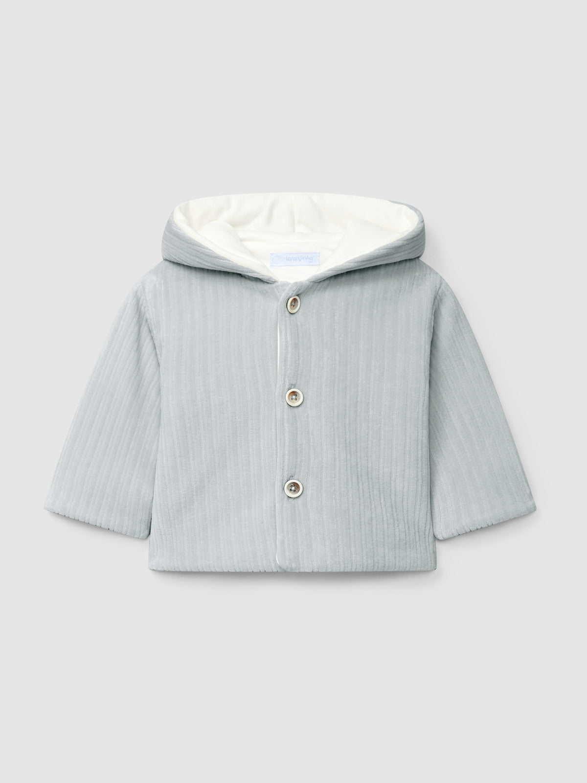 Giacca con cappuccio in velluto a coste larghe con interno foderato in jersey di cotone. Chiusura con bottoni effetto legno sul davanti.