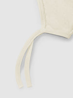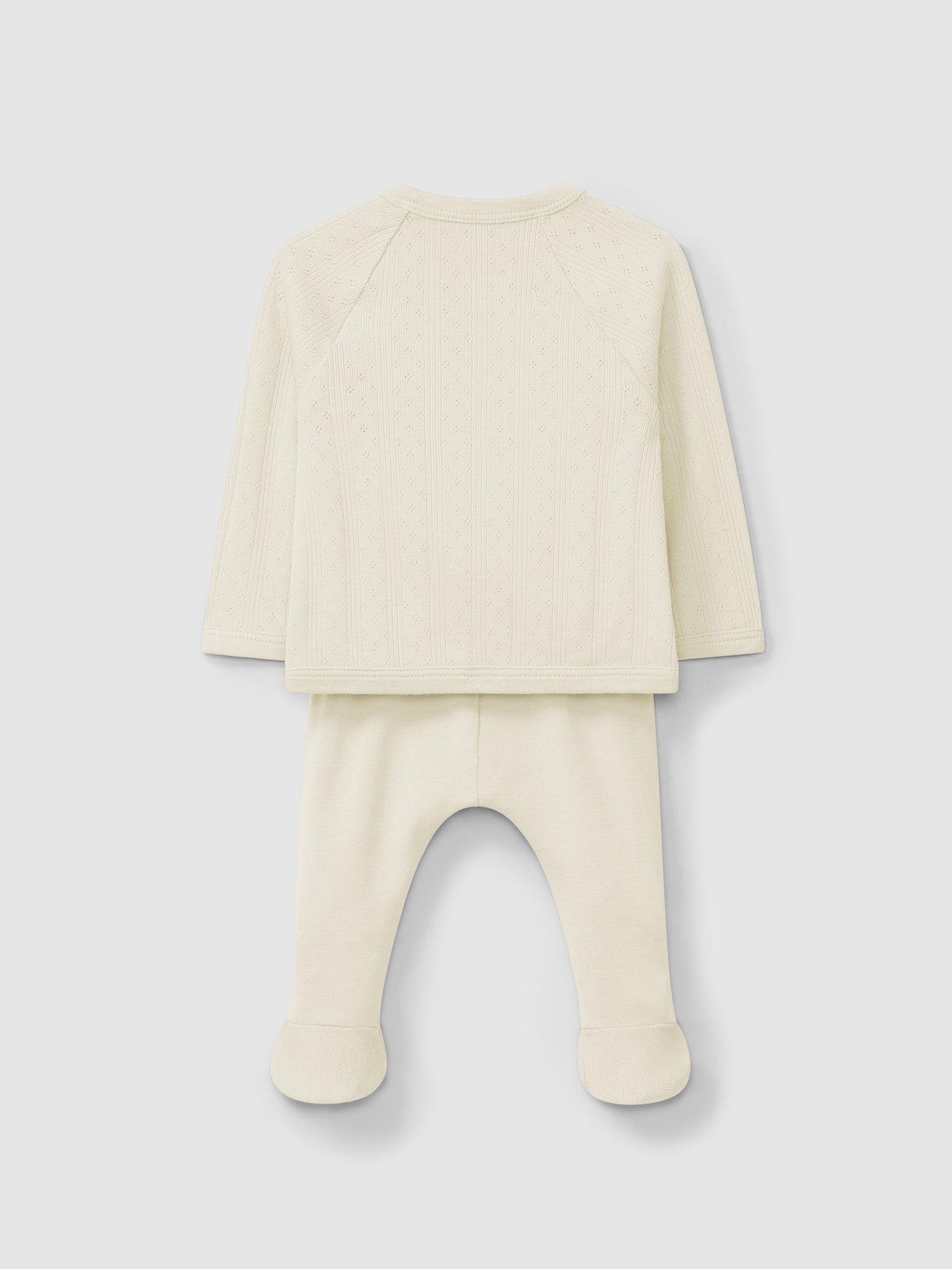 Coprifasce incrociato con motivo ajour, chiusura con bottone in legno all'esterno e bottone automatico all'interno. Pantaloni pull-up semplici con piedini e bottoni decorativi in legno sul davanti. Berretto con motivo Ajour con dettagli della silhouette dello stesso colore per completare il look.