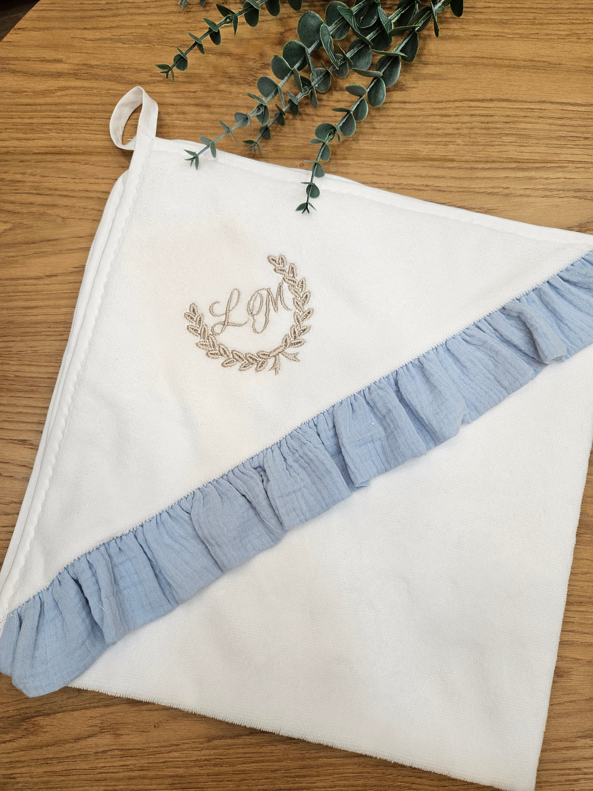 Accappatoio e asciugamano grande per neonato in spugna di cotone, dettagli in mussola di cotone.