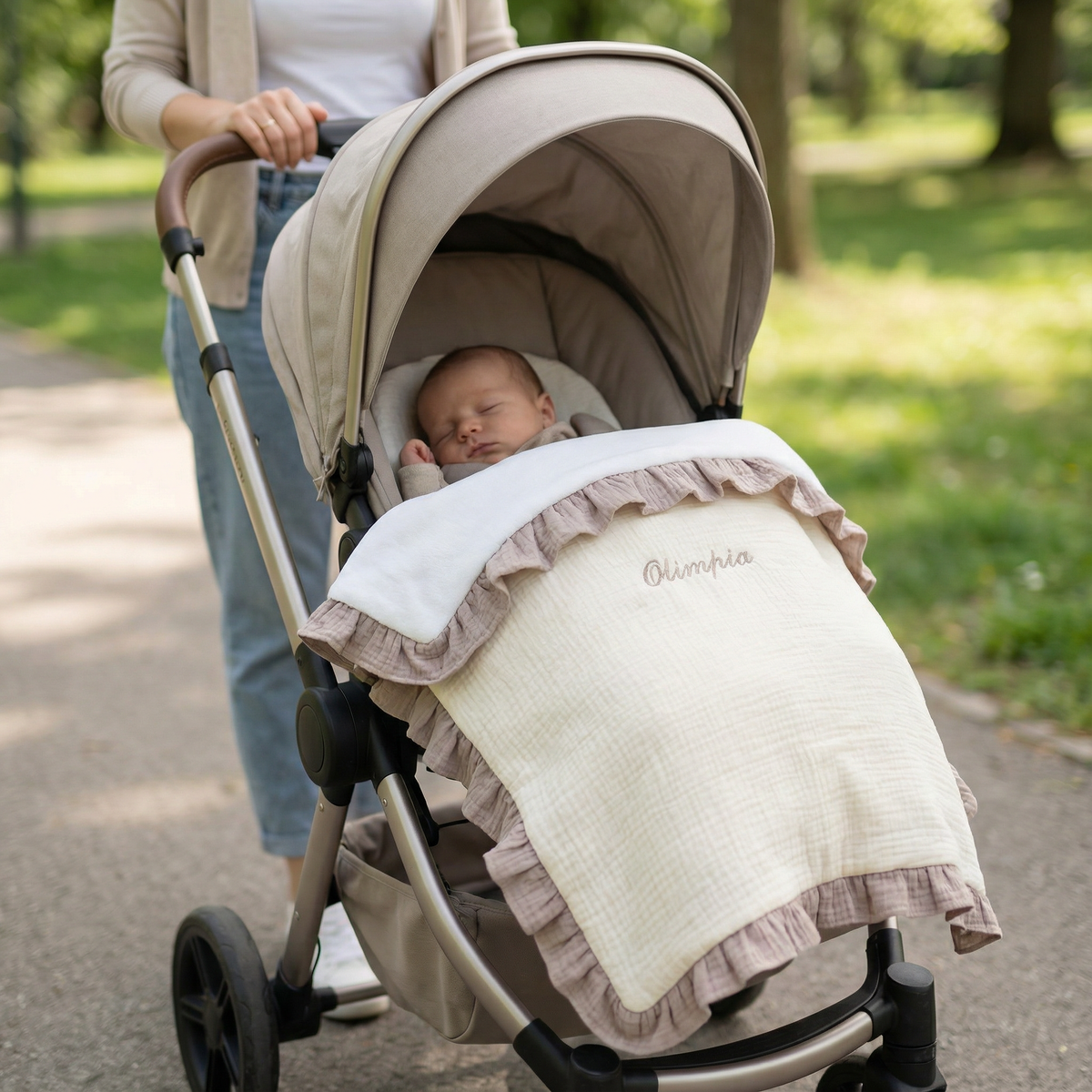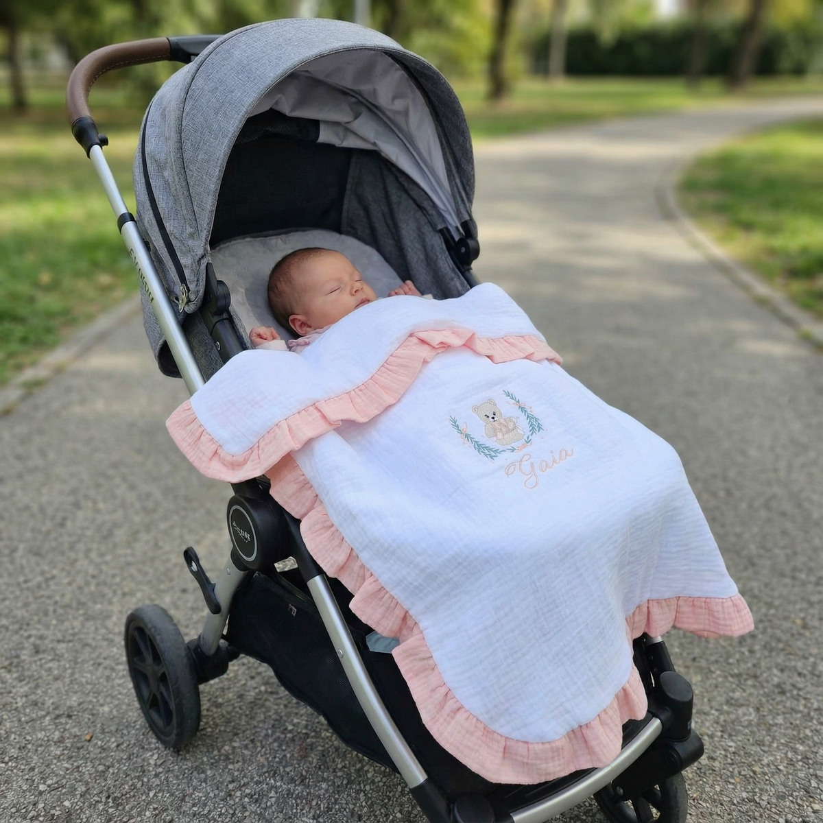 Una copertina morbidissima e avvolgente, realizzata in mussola di alta qualità e caldo pile, pensata per garantire il massimo comfort al tuo bambino.