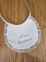 Prezzo unitario perelicato bavaglino in lino bianco, impreziosito da raffinato pizzo, che dona un fascino di tradizione senza tempo. Un accessorio elegante e sofisticato, pensato per accompagnare con stile un giorno davvero speciale come il Battesimo.