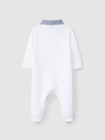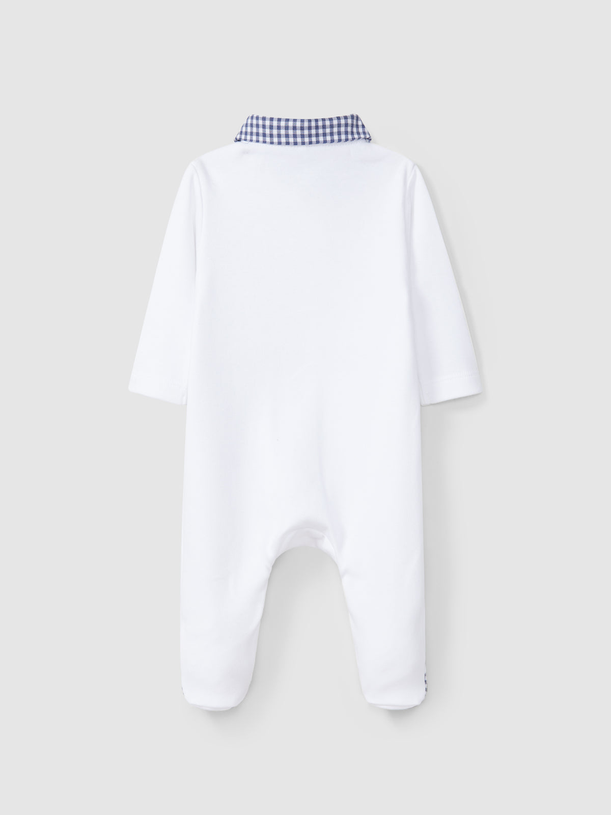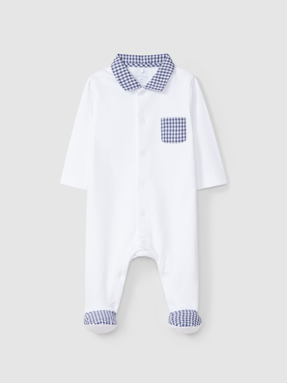 In jersey di cotone cardato al 100%. Dettagli in tessuto scozzese Vichy. Chiusura con bottoni automatici a tutta lunghezza sul davanti e tra le gambe.