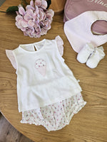 Scopri il completino due pezzi in cotone. T shirt e culottina con fiorellini colorati.