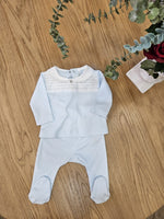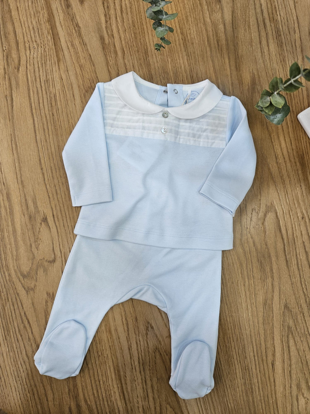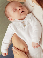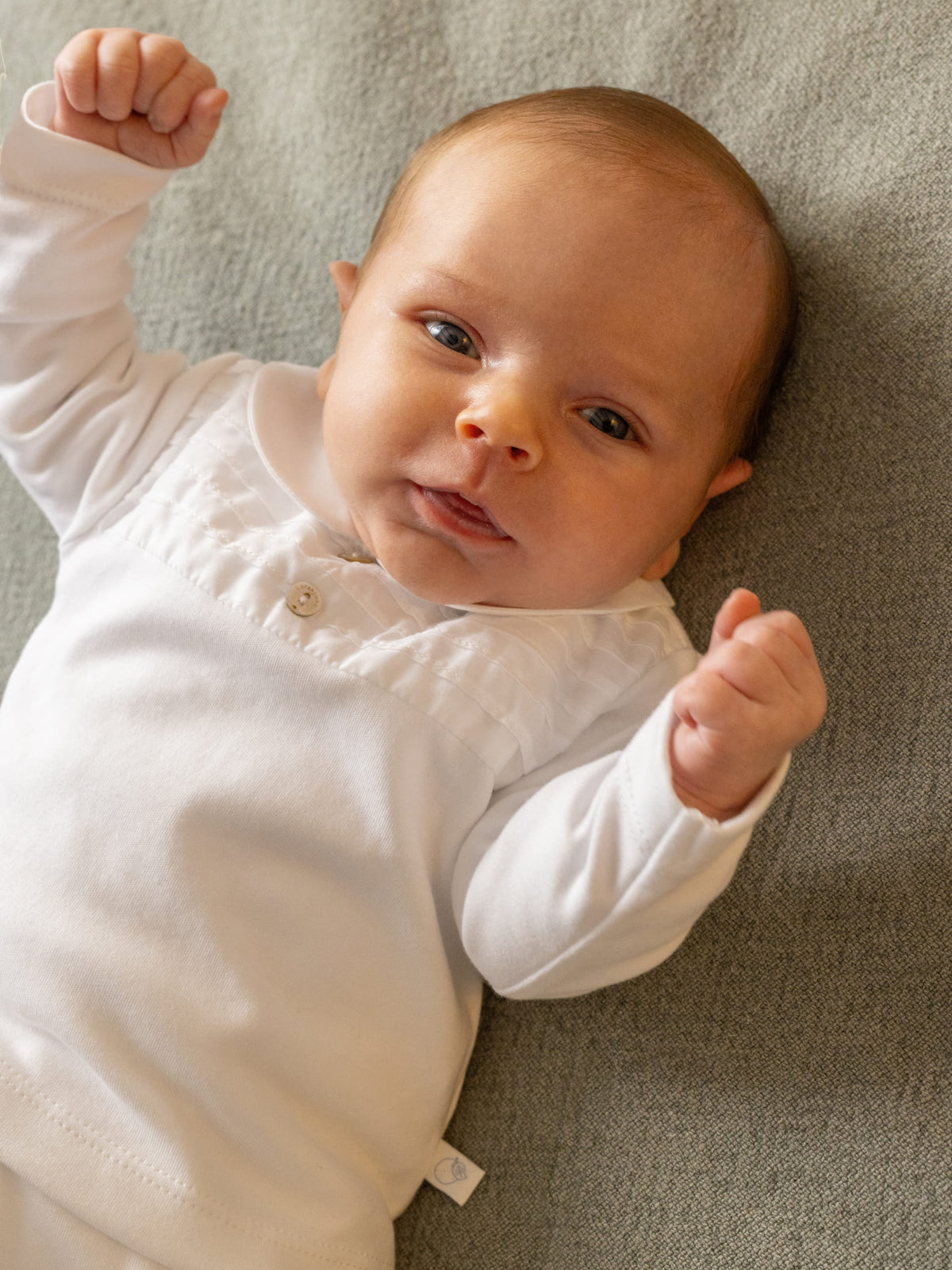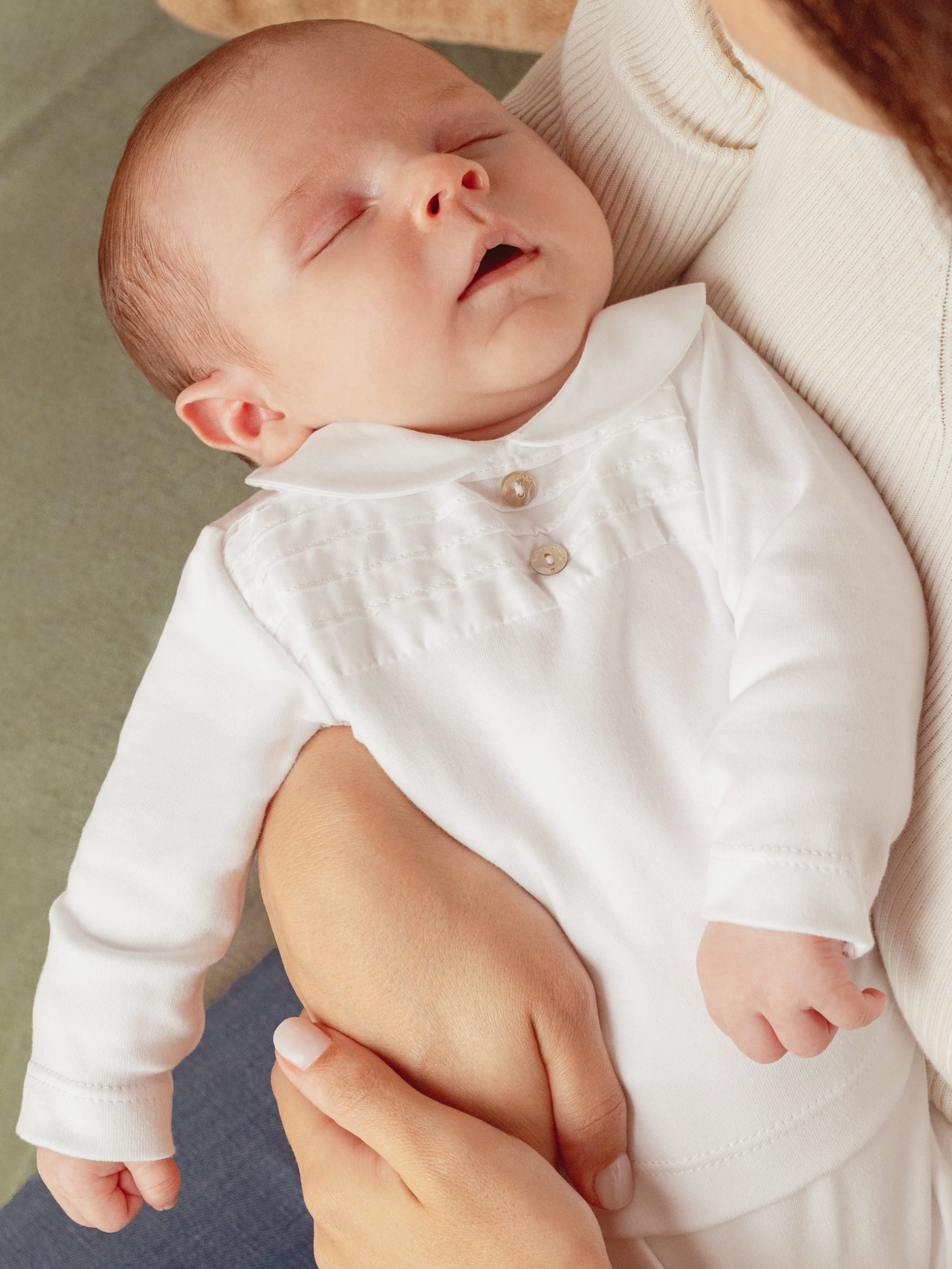 Completo due pezzi in jersey 100% cotone. Maglia con collo tondo e carré in tessuto a costine sul petto. Dettaglio bottoni decorativi Laranjinha in madreperla. Si chiude con bottoni automatici sul retro. Pantaloni con elastico in vita per un maggiore comfort.