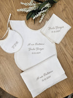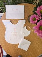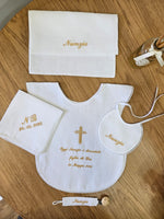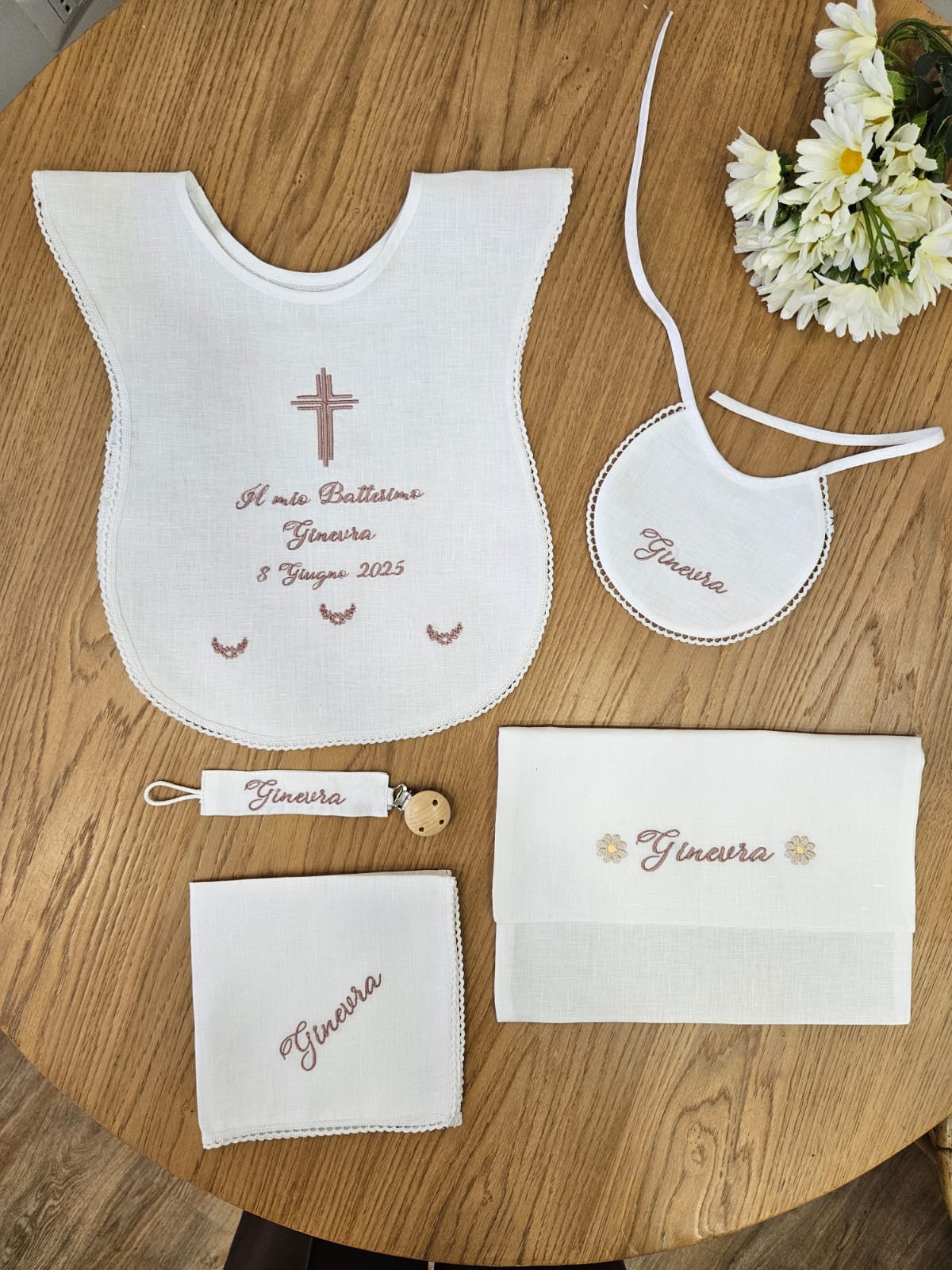 Prezzo unitario perUn coordinato completo in puro lino bianco per il giorno del Battesimo composto da un camicino battesimale, un bavaglino, un portaciuccio, un fazzoletto per asciugare la testa del bambino.