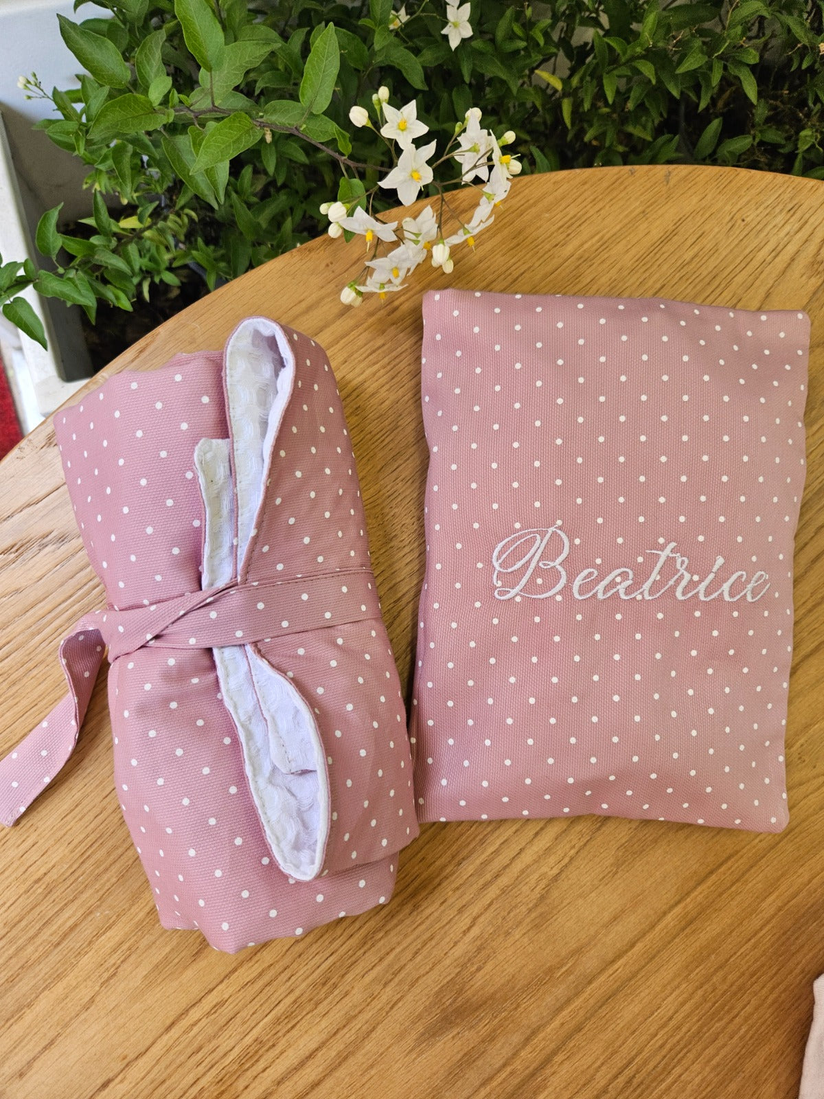 Il coordinato comprende un comodo portapannolini e una fasciatoio da viaggio, entrambi realizzati in morbido cotone, delicato sulla pelle e facile da lavare. Il portapannolini è ideale per tenere in ordine salviette, pannolini e quadrati per il cambio, mantenendo tutto a portata di mano. Il fasciatoio da viaggio, leggero e pratico, offre il comfort di un morbido asciugamano in spugna, garantendo igiene e comodità ovunque tu sia.