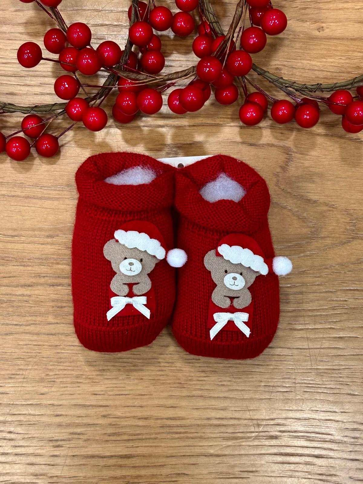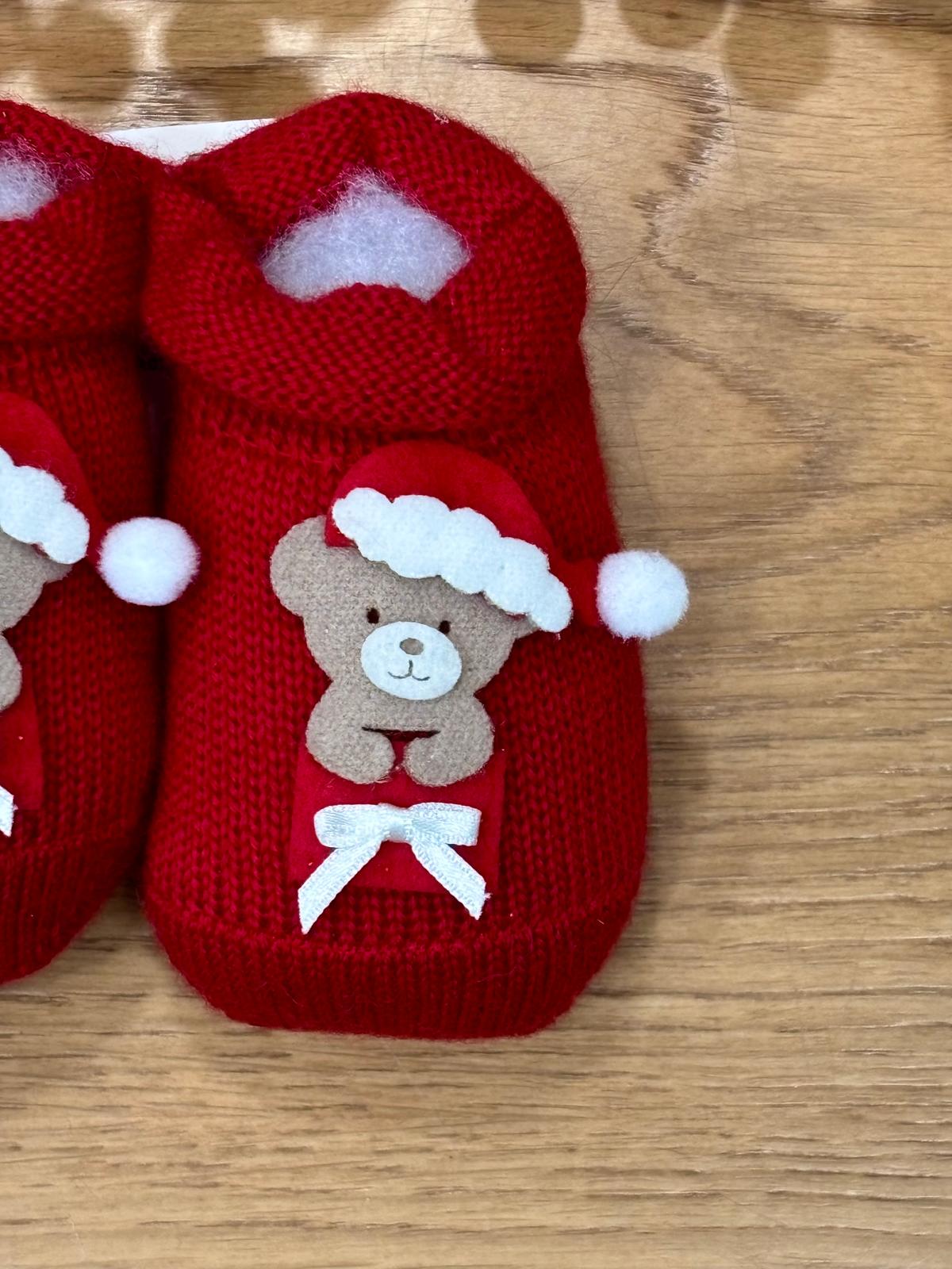 Prezzo unitario perBabbucce per neonato in pura lana vergine rossa con orsacchiotto di Natale.