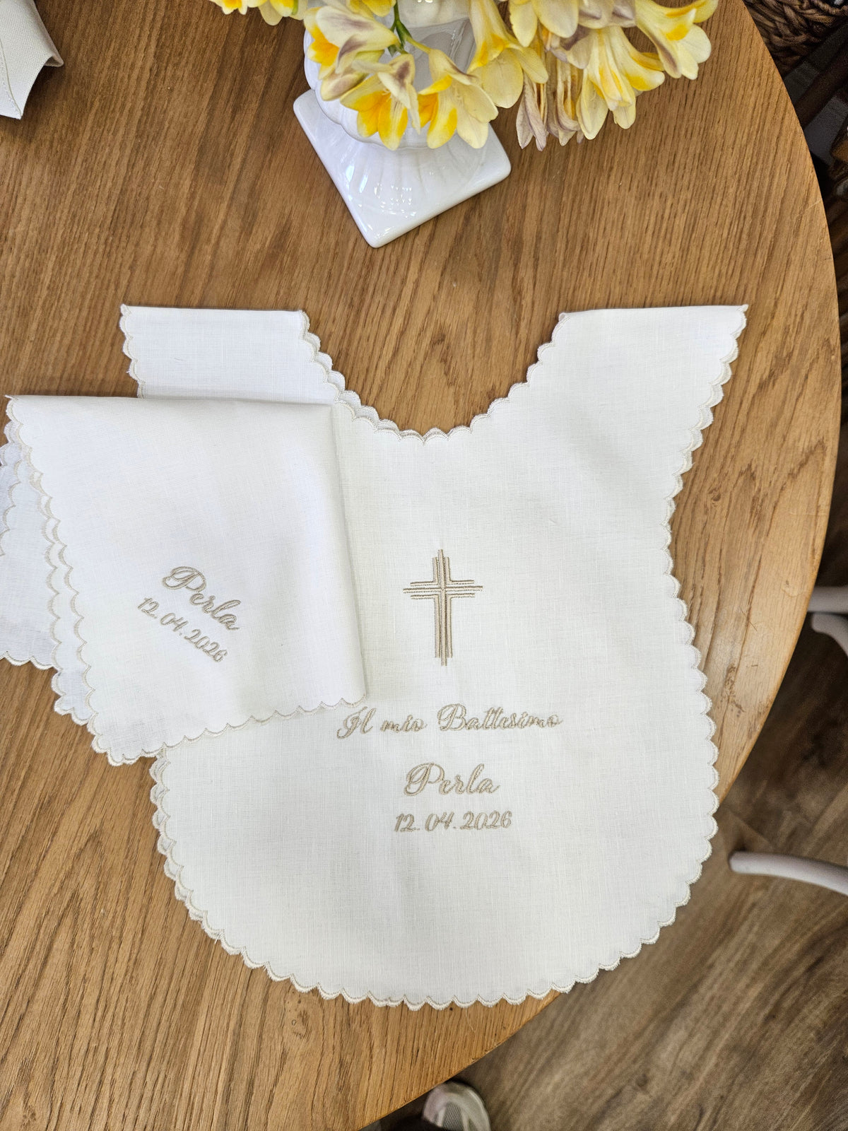 Coordinato completo in lino per il giorno del Battesimo composto da un camicino battesimale ed un fazzoletto per asciugare la testa del bambino.