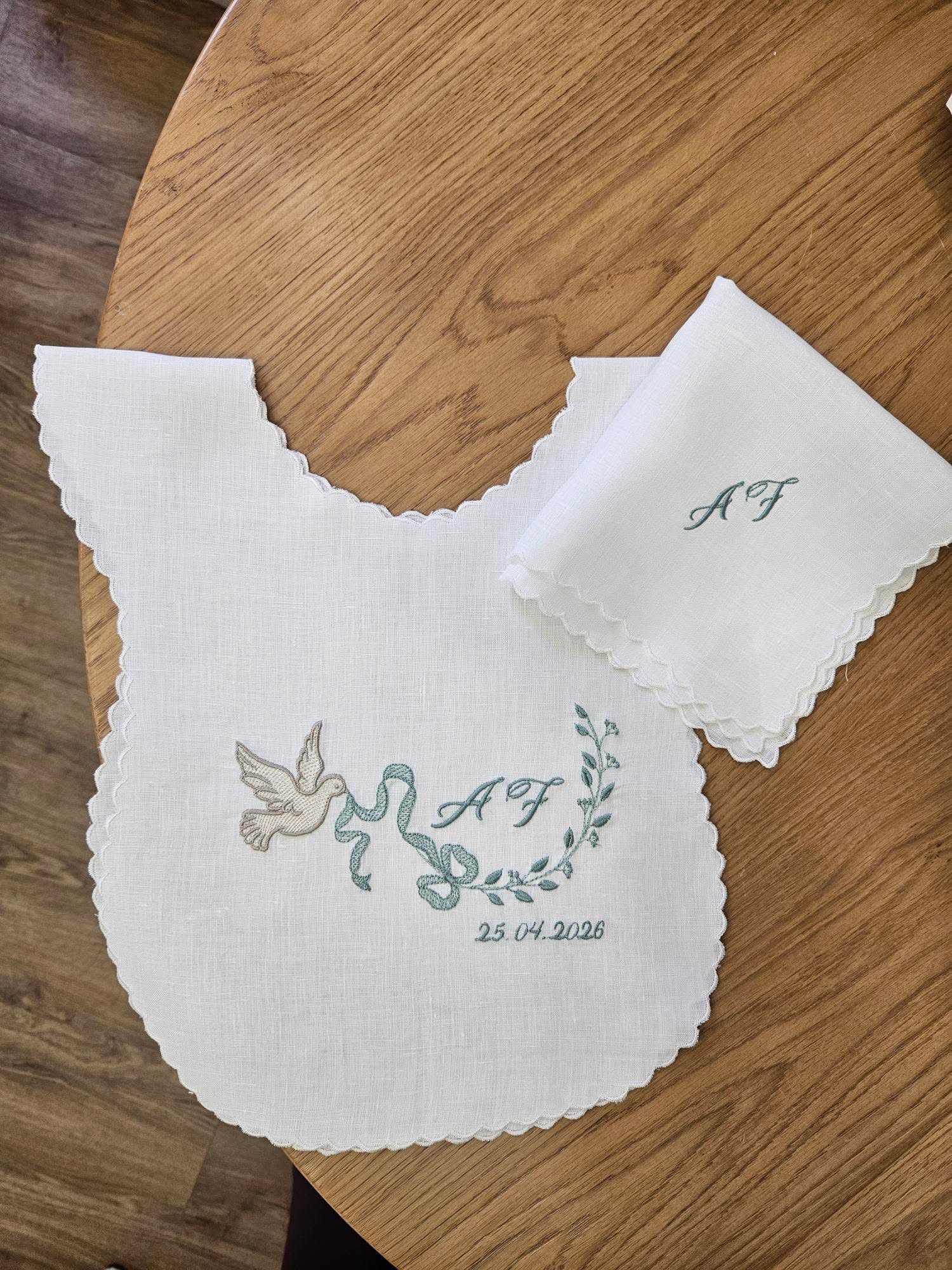 Per quanto riguarda la personalizzazione del coordinato, puoi selezionare il colore del tessuto e aggiungere il ricamo con il nome, la data o una breve frase. In base alla lunghezza del testo, si può scegliere anche un disegno. Inoltre, è possibile personalizzare il fazzoletto con le iniziali o il nome del bambino.